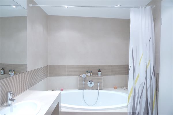 Modernisiertes und großzügiges Designer Bad, hier kann der Tag gemütlich in einer großen ovalen Badewanne ausklingen.
