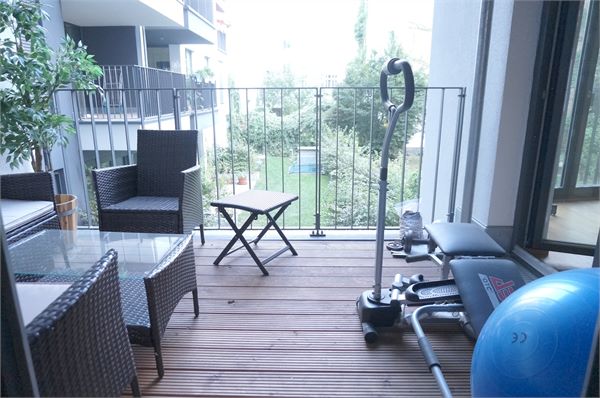 Der Balkon mit Ausblick in den wunderschön grünen Innenhof beherbergt außerdem diverses Sport Equipment.