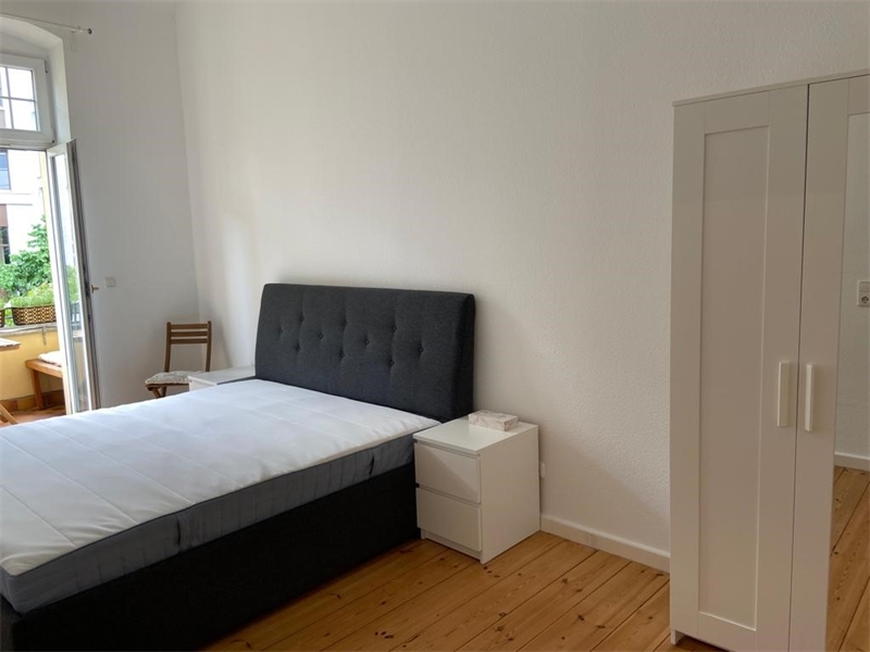 Das Schlafzimmer verfügt über einen Zugang zum Balkon. Der Balkon ist zur Stargarder Straße ausgerichtet und bietet einen Blick auf die typische Berliner Altbauarchitektur des Kiezes.