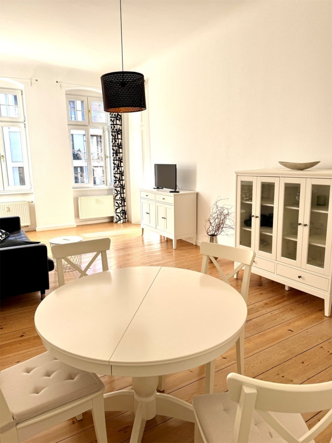 Das großzügige Wohnzimmer mit großen Fenstern bietet viel Tageslicht und ausreichend Platz für einen Wohn- und Essbereich. Die typischen Altbauelemente verleihen dem Raum eine offene und freundliche Atmosphäre.