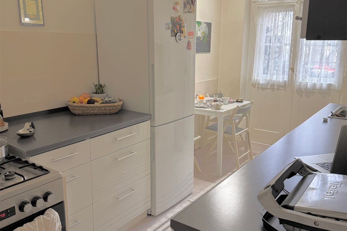 Die Küche ist als separater Raum ausgeführt und bietet neben einer funktionalen Küchenzeile auch Platz für einen kleinen Essbereich. Von hier aus besteht direkter Zugang zum Balkon, der zum ruhigen Innenhof ausgerichtet ist. Der Blick geht in eine begrünte Hofanlage mit gewachsenem Baumbestand, was zu einer insgesamt ruhigen Wohnlage beiträgt.