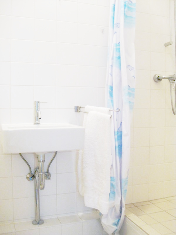 Das Badezimmer verfügt über moderne Sanitäranlagen inklusive Dusche.
